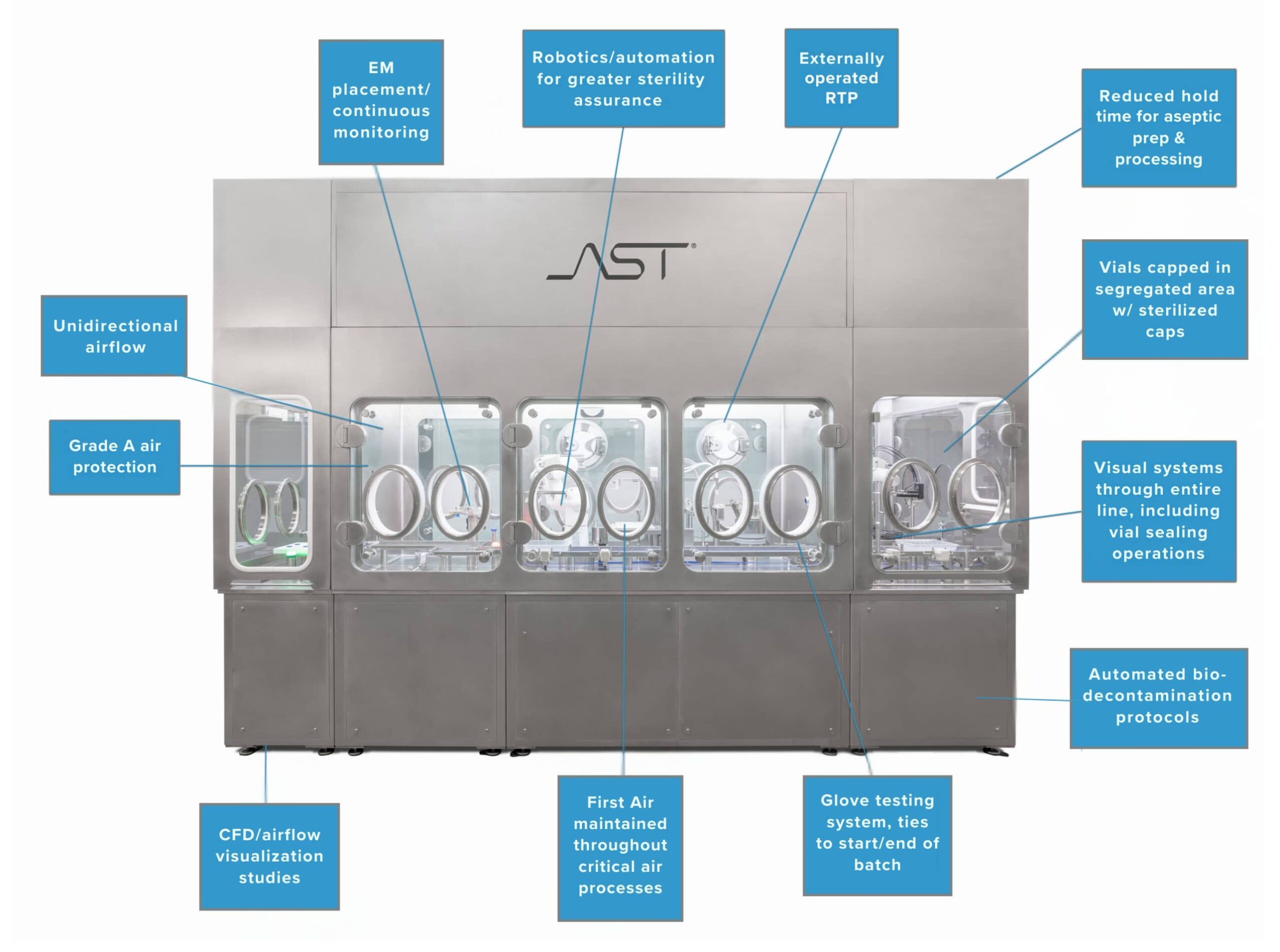 AST’s aseptic processing systems are not only built with an eye towards efficiency and innovation; they’re designed to be intuitive tools that are regulatorily robust and forward-looking. As pioneers in the use of robotics in the aseptic fill-finish space, we provide customers with the technological solutions, service, and expertise needed to navigate all aspects of the drug development process, from project planning to aftermarket care and every manufacturing and regulatory uncertainty in between.